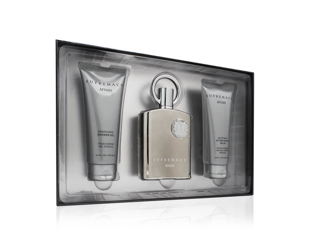 Afnan Supremacy Silver dárková sada pro muže parfémovaná voda 100 ml + sprchový gel 100 ml + balzám po holení 100 ml