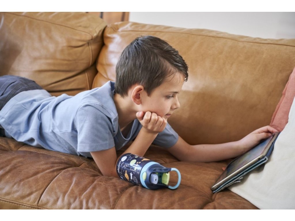 Děti si s radostí stisknou tlačítko pro otevření vyskakovacího brčka, které umožňuje snadné pití jednou rukou. Hubičku lze zasunout pod kryt, což ji chrání před špínou a nečistotami. Chytře navržená výlevka eliminuje všechna zákoutí, v nichž by se mohly hromadit nečistoty a špína, a víčko lze snadno demontovat pro čištění s plným přístupem. Vhodné pro předškoláky a prvňáčky.