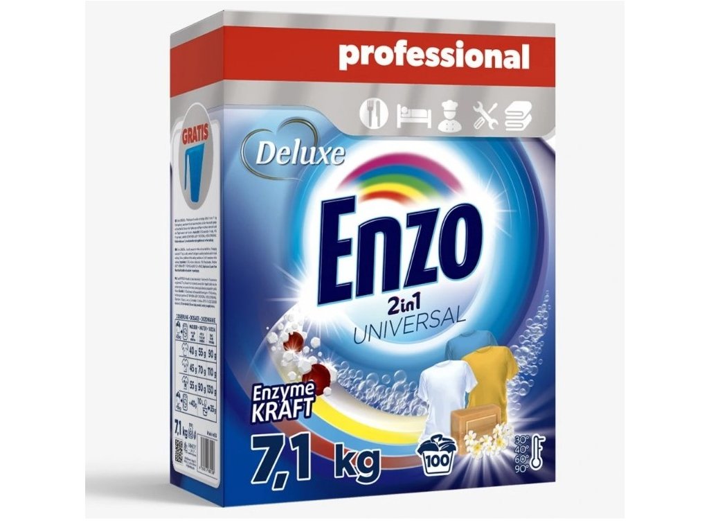 Deluxe Enzo prací prášek Professional UNIVERSAL je univerzální prací prášek s inovativní technologií pro odstranění nečistot a skvrn, určený pro všechny typy praček a také pro ruční praní. Prací prášek dosahuje při praní výborných výsledků při praní prádla běžného znečištění. Oživuje vybledlé barvy a obnovuje původní. Tento prací prášek je vhodný především na bílé a stálobarevné prádlo.