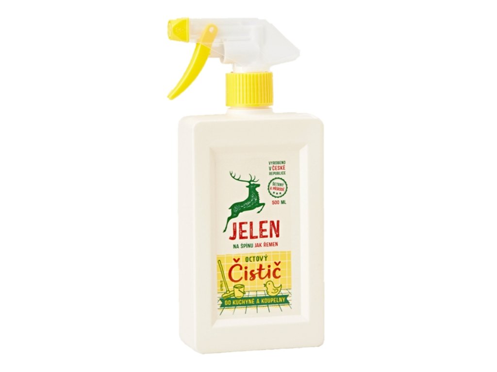 Už Jelenova babička drhla vodní kámen a silnou špínu octem. Proto Jelenův čistič na bázi octa v kuchyni i koupelně tak dobře funguje. Nechtě jej po nanesení chvíli působit a pak teprve vyčistěte a opláchněte. Bude-li potřeba, vůni octa vyvětrejte. Vyvarujte se povrchů citlivých na kyseliny.