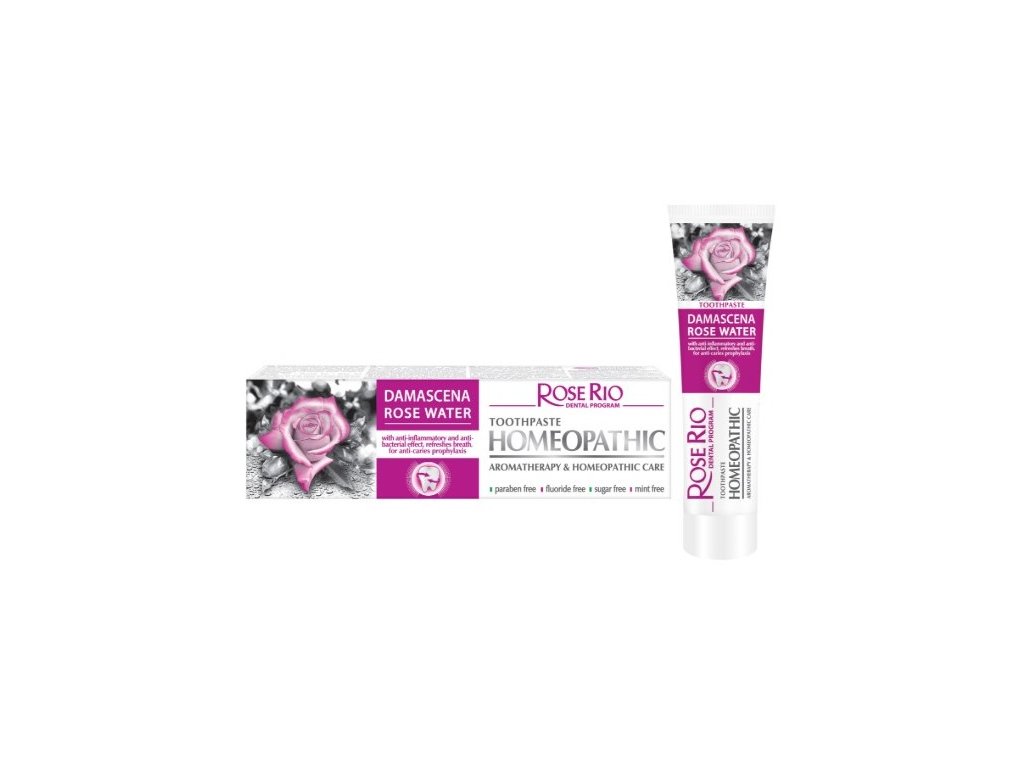 Zubní pasta vhodná pro použití při homeopatické léčbě. Zabraňuje tvorbě zubního plaku a pečuje o zdraví dásní. Zubní pasta je obohacená o organickou růžovou vodu, která má silný protizánětlivý účinek, a xylitol s přírodním účinkem proti zubnímu kazu, který snižuje zápach z úst a suchost v ústech. Jemná příchuť Damašská růže (Rosa Damascena) - příjemně tonizuje a osvěžuje dech. Vhodné pro celou rodinu.