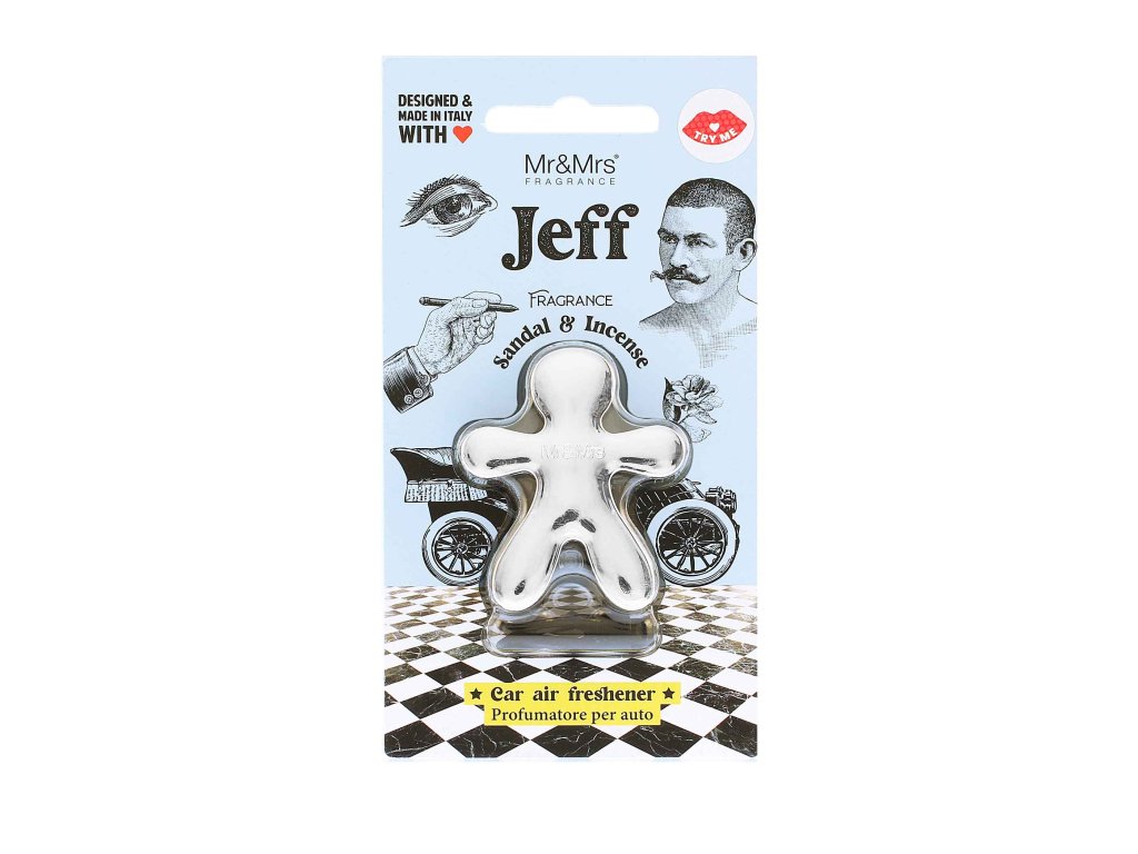 Santalové dřevo a kadidlo. Voňavý panáček Jeff v chromovém provedení obsahuje speciální esenciální oleje, které provoní váš vůz po dobu 30 dní. Bojuje s nepříjemnými pachy, jako je například kouř z cigaret a příjemně osvěží vzduch. Neobsahuje alkohol. Panáčka stačí zasunout do ventilátoru auta díky úchytu, který má na zádech.Doplňkové parametry